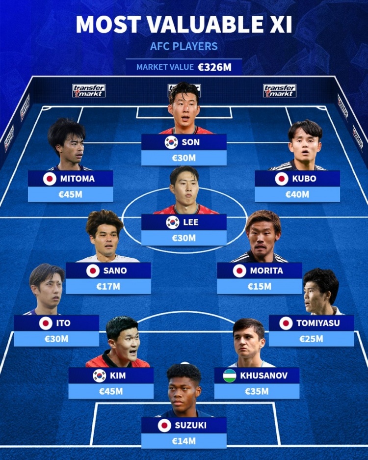 亞洲德轉(zhuǎn)身價(jià)最高陣:孫興慜、三笘薫、胡桑諾夫在列,日本占7席
